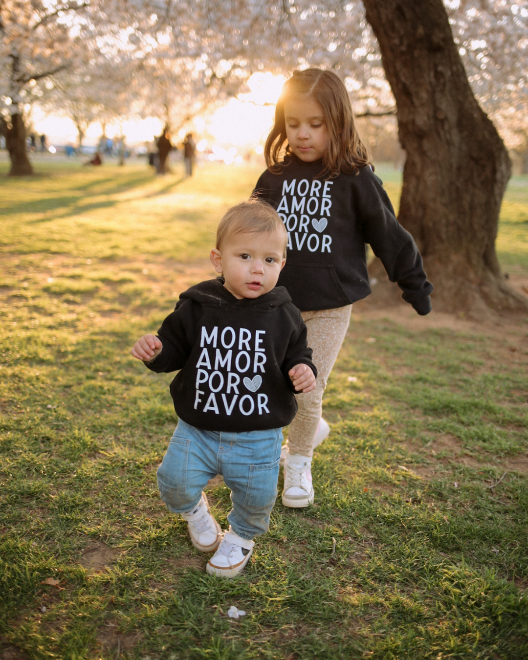 "More Amor Por Favor" is one of our most favorite rhymey-spanglish phrases ever! It means "more love, please!" NOW ON A HOODIE! Buy one for yourself and for your little love for the cutest parent-chiqui matching. Also makes the cutest new baby announcement!